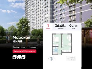 Продается 1-комнатная квартира в ЖК "Морская миля" на 9 этаже. Общая площадь составляет 36.45 кв. м. Квартира с чистовой отделкой. Жилой комплекс "Морская миля" располагается по адресу Санкт-Петербург, Красносельский.