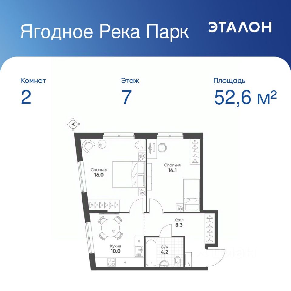 Общая площадь квартиры — 52.6 кв. м, этаж 7 из 12.