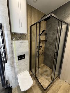 Санузлы: 2 санузла. Первый — с душевой кабиной. Второй — просторный (6 м²) с ванной, колонной со стиральной и сушильной машинами и глубоким шкафом.