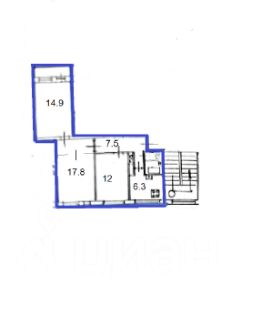 Жилая площадь - 43.5 кв.м, кухня - 6.3 кв.м, комнаты - 12+17.8+14.9 кв.м, большой коридор - 7.5 кв.м