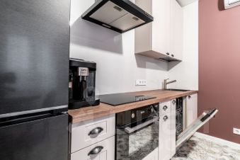 Кухня: индукционная варочная панель Weissgauff, духовой шкаф с функцией микроволновой печи Weissgauff, вытяжка Krona, посудомоечная машина Krona (45 см), холодильник Beko no frost.