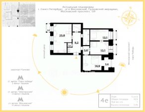 3 комнаты выходят на Парк Победы. Одна мастер-спальня с застекленной лоджией, проходной кабинет. Из кабинета вход во вторую спальню. Кабинет и вторая спальня с балконами.