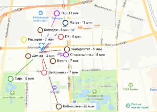 В шаговой доступности от дома расположены школы и детские сады (см. схему), что удобно для семей с детьми.