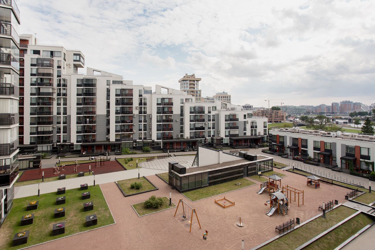 В доме имеется свой выход на набережную, хорошая придомовая территория, оснащенная детскими площадками, скамейками, прогулочными зонами.