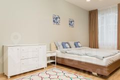 Квартира расположена на втором этаже комплекса и имеет эргономичную планировку, состоящую из просторной кухни 24,5 м2, гостиной 28.3 м2, двух спален (19,3 м2 и 19,4 м2), двух с/у, коридора и застекленной большой лоджии 7,5 м2, Высота потолков три метра. В квартире выполнен современный ремонт, стоят хорошие финские стеклопакеты. Удобный кухонный гарнитур с каменной столешницей, встроенная техника остаются новому собственнику.