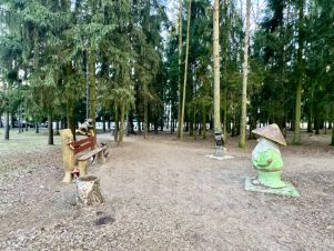 Во дворе дома детская площадка и место отдыха сквер На неведомых дорожках: красивые сказочные фигуры, скамейки, качели в сказочном стиле, обустроенные дорожки.