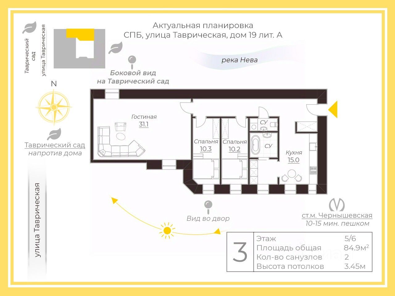 Арт. 127678595 Исторический дом в одной из самых престижных локаций города — прямо напротив Таврического сада, до входа всего 50 метров. Квартира площадью 84,9 м² расположена на 5 этаже, в парадной есть лифт — редкое и очень ценное преимущество. Высокие потолки 3,45 м добавляют воздуха, света и ощущения настоящего петербургского масштаба.