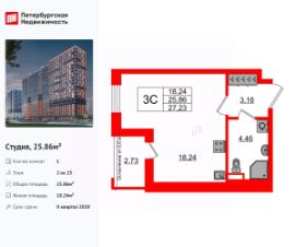 Удобная, классическая, функциональная европланировка, вместительная прихожая 3.16 м². Общая площадь студии - 25.86 м², жилая 18.24 м², высота потолка 2.77 м.