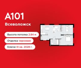 2-комнатная квартира площадью 57.20 в ЖК "А101 Всеволожск" на 2 этаже. Квартира без отделки. Вид из окна во двор. В квартире 1 санузел. Высота потолков 2.84 м.