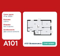 2-комнатная квартира площадью 56.80 в ЖК "А101 Всеволожск" на 5 этаже. Квартира без отделки. Вид из окна во двор. В квартире 1 санузел. Высота потолков 2.84 м.