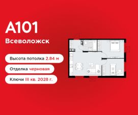 2-комнатная квартира площадью 54.40 в ЖК "А101 Всеволожск" на 5 этаже. Квартира без отделки. Вид из окна во двор. В квартире 1 санузел. Высота потолков 2.84 м.