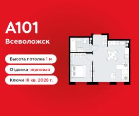 1-комнатная квартира площадью 41.90 в ЖК "А101 Всеволожск" на 5 этаже. Квартира без отделки. Вид из окна во двор. В квартире 1 санузел. Высота потолков 2.84 м.