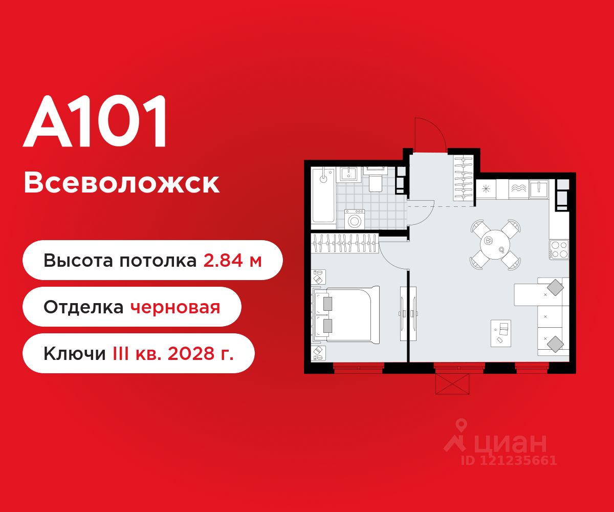 1-комнатная квартира площадью 41.90 в ЖК "А101 Всеволожск" на 8 этаже. Квартира без отделки. Вид из окна на улицу. В квартире 1 санузел. Высота потолков 2.84 м.