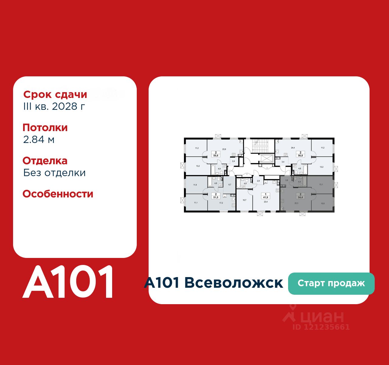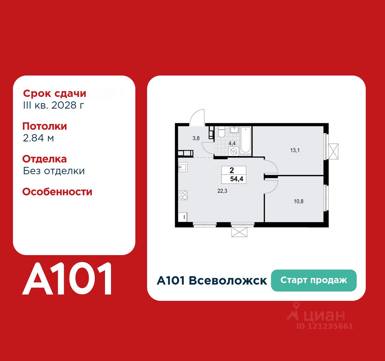 2-комнатная квартира площадью 54.40 в ЖК "А101 Всеволожск" на 7 этаже. Квартира без отделки. Вид из окна на улицу. В квартире 1 санузел. Высота потолков 2.84 м.