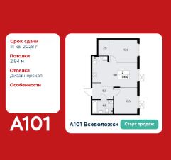 2-комнатная квартира площадью 54.00 в ЖК "А101 Всеволожск" на 9 этаже. Квартира с отделкой. Вид из окна во двор. В квартире 1 санузел. Высота потолков 2.84 м.