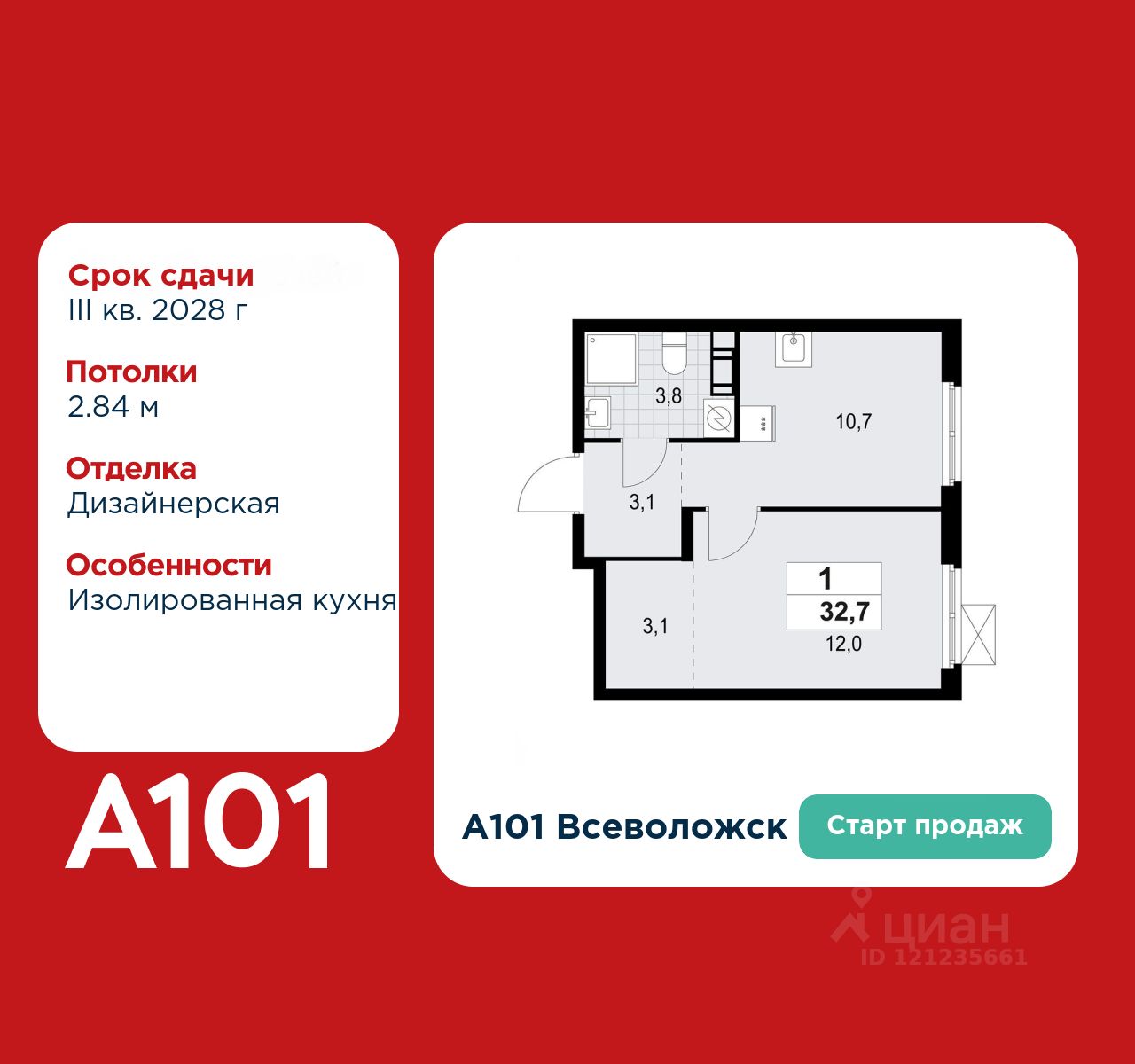 1-комнатная квартира площадью 32.70 в ЖК "А101 Всеволожск" на 7 этаже. Квартира с отделкой. Вид из окна на улицу. В квартире 1 санузел. Высота потолков 2.84 м.