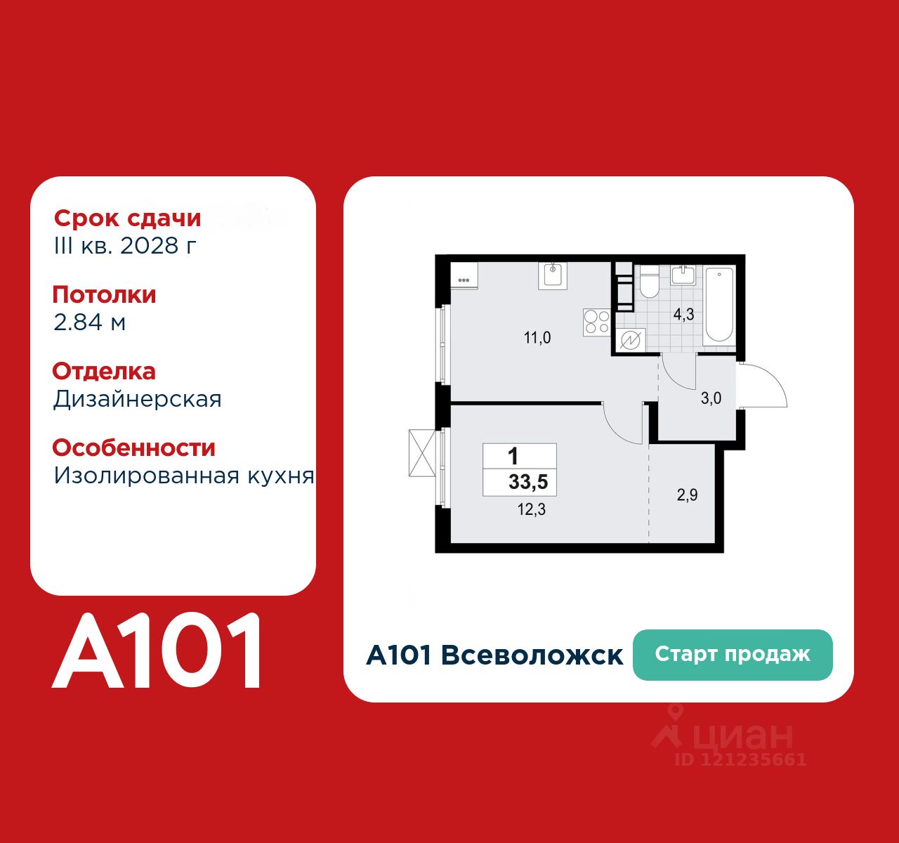 1-комнатная квартира площадью 33.50 в ЖК "А101 Всеволожск" на 7 этаже. Квартира с отделкой. Вид из окна на улицу. В квартире 1 санузел. Высота потолков 2.84 м.