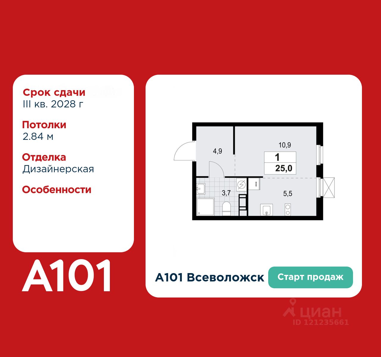 Студия площадью 25.00 в ЖК "А101 Всеволожск" на 6 этаже. Квартира с отделкой. Вид из окна на улицу. В квартире 1 санузел. Высота потолков 2.84 м.