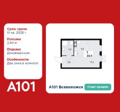 Студия площадью 24.50 в ЖК "А101 Всеволожск" на 8 этаже. Квартира с отделкой. Вид из окна на улицу. В квартире 1 санузел. Высота потолков 2.84 м.