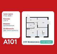 2-комнатная квартира площадью 48.60 в ЖК "А101 Всеволожск" на 8 этаже. Квартира с отделкой. Вид из окна на улицу. В квартире 1 санузел. Высота потолков 2.84 м.