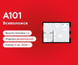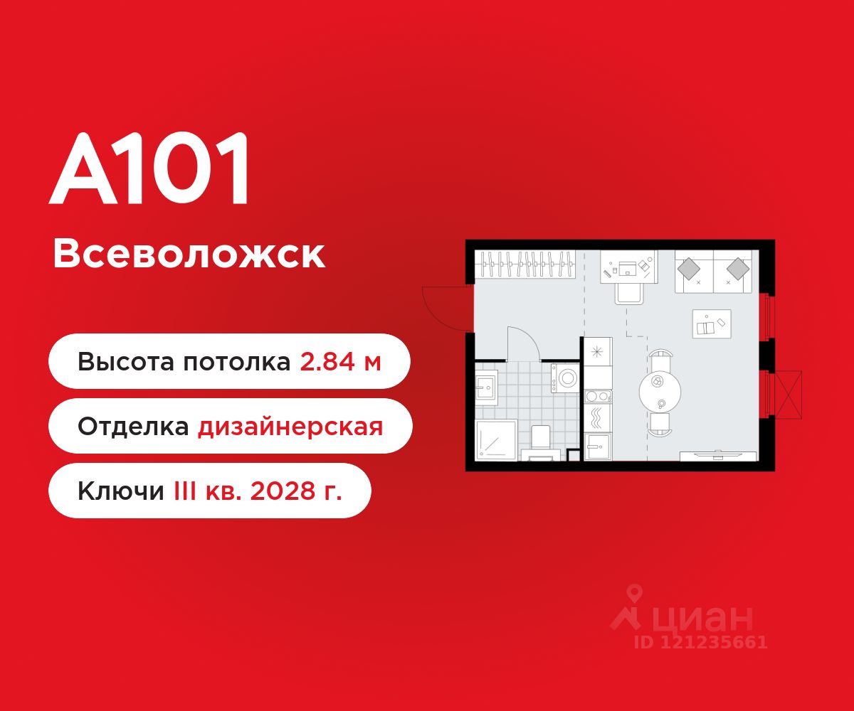 Студия площадью 25.50 в ЖК "А101 Всеволожск" на 2 этаже. Квартира с отделкой. Вид из окна во двор. В квартире 1 санузел. Высота потолков 2.84 м.