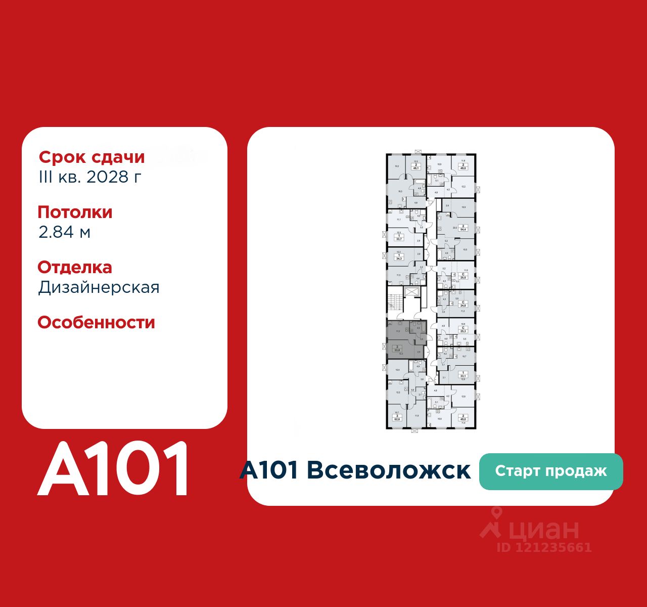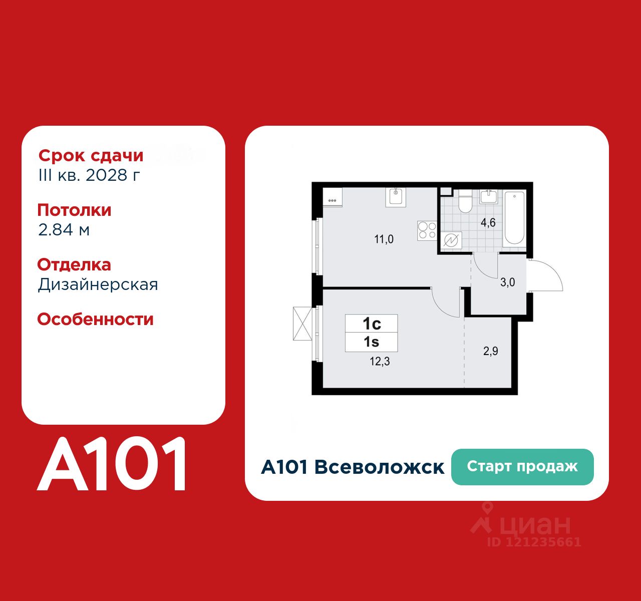 1-комнатная квартира площадью 33.80 в ЖК "А101 Всеволожск" на 2 этаже. Квартира с отделкой. Вид из окна во двор. В квартире 1 санузел. Высота потолков 2.84 м.