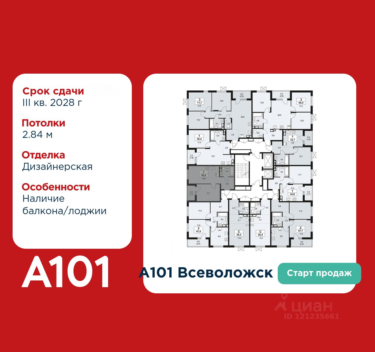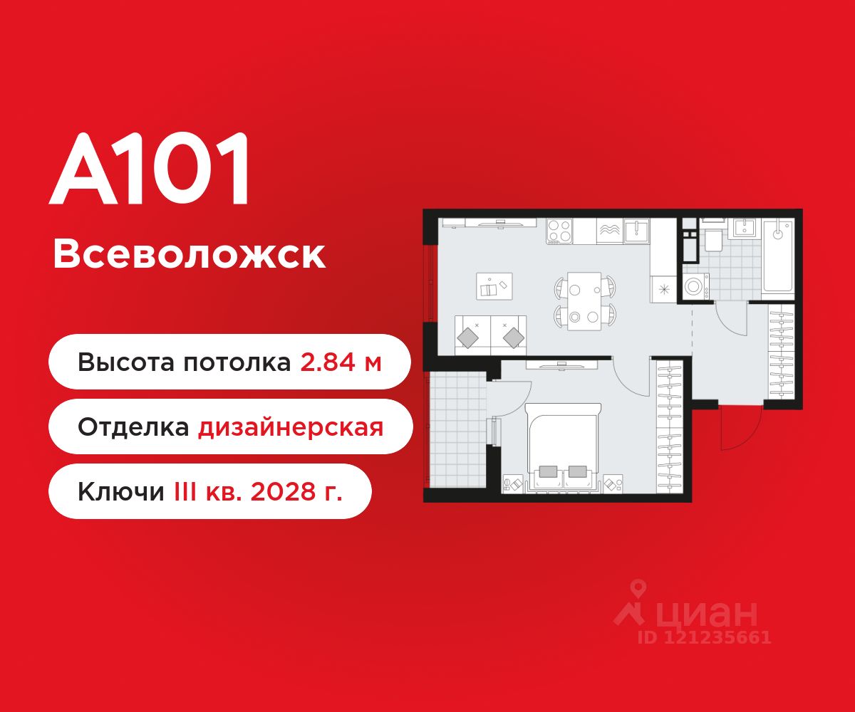1-комнатная квартира площадью 39.80 в ЖК "А101 Всеволожск" c лоджией на 7 этаже. Квартира с отделкой. Вид из окна во двор. В квартире 1 санузел. Высота потолков 2.84 м.