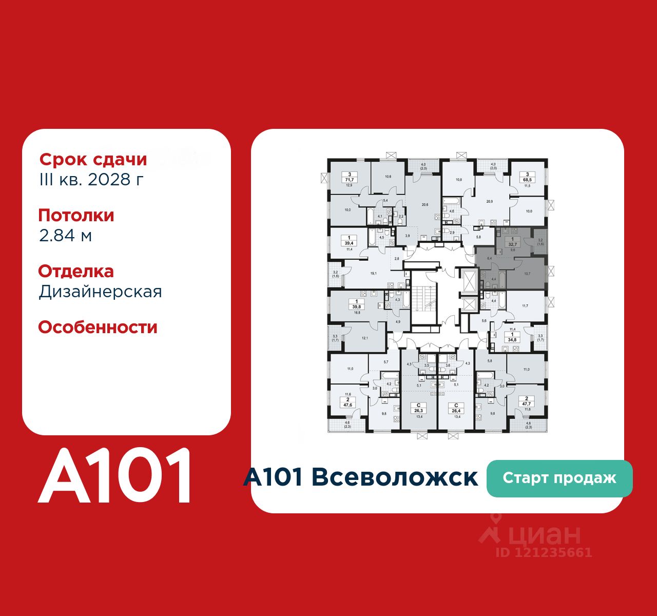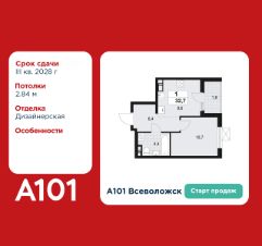 1-комнатная квартира площадью 32.70 в ЖК "А101 Всеволожск" c лоджией на 7 этаже. Квартира с отделкой. Вид из окна во двор. В квартире 1 санузел. Высота потолков 2.84 м.