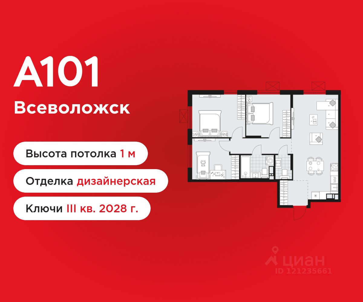 3-комнатная квартира площадью 74.60 в ЖК "А101 Всеволожск" на 5 этаже. Квартира с отделкой. Вид из окна во двор. В квартире 2 санузла. Высота потолков 2.84 м.