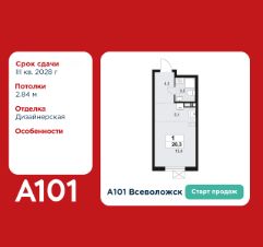 Студия площадью 26.30 в ЖК "А101 Всеволожск" на 8 этаже. Квартира с отделкой. Вид из окна на улицу. В квартире 1 санузел. Высота потолков 2.84 м.