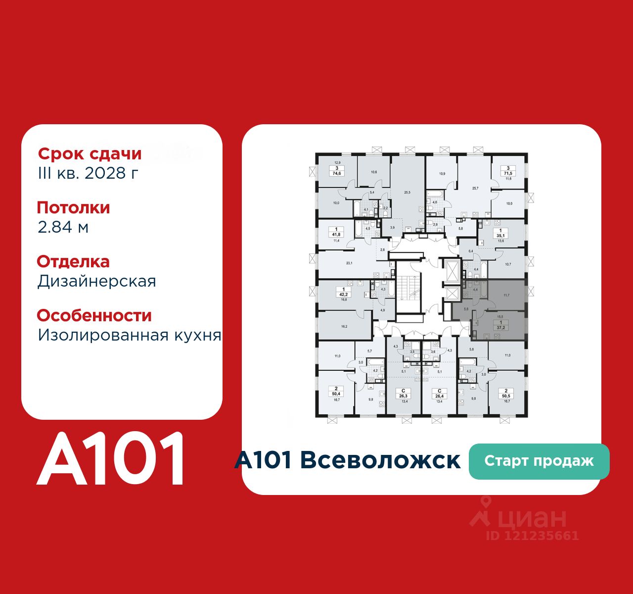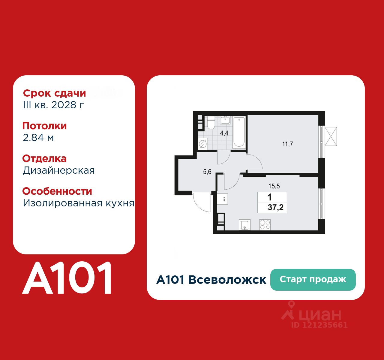 1-комнатная квартира площадью 37.20 в ЖК "А101 Всеволожск" на 6 этаже. Квартира с отделкой. Вид из окна на улицу. В квартире 1 санузел. Высота потолков 2.84 м.