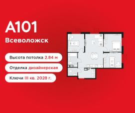 3-комнатная квартира площадью 71.20 в ЖК "А101 Всеволожск" на 3 этаже. Квартира с отделкой. Вид из окна во двор. В квартире 2 санузла. Высота потолков 2.84 м. Особенность планировки - гардеробная.