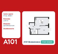 1-комнатная квартира площадью 35.00 в ЖК "А101 Всеволожск" на 4 этаже. Квартира с отделкой. Вид из окна на улицу. В квартире 1 санузел. Высота потолков 2.84 м.