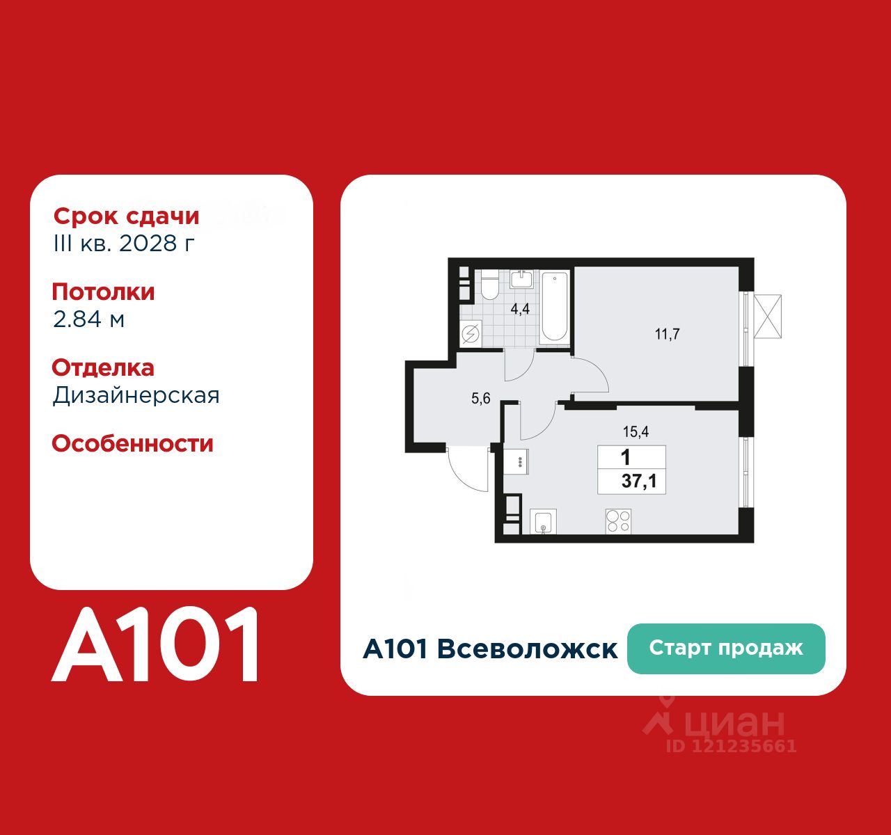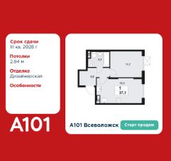 1-комнатная квартира площадью 37.10 в ЖК "А101 Всеволожск" на 4 этаже. Квартира с отделкой. Вид из окна на улицу. В квартире 1 санузел. Высота потолков 2.84 м.