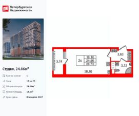 Удобная, классическая, функциональная европланировка, просторная прихожая 3.63 м². Общая площадь студии - 24.86 м², жилая 18.1 м², высота потолка 2.77 м.