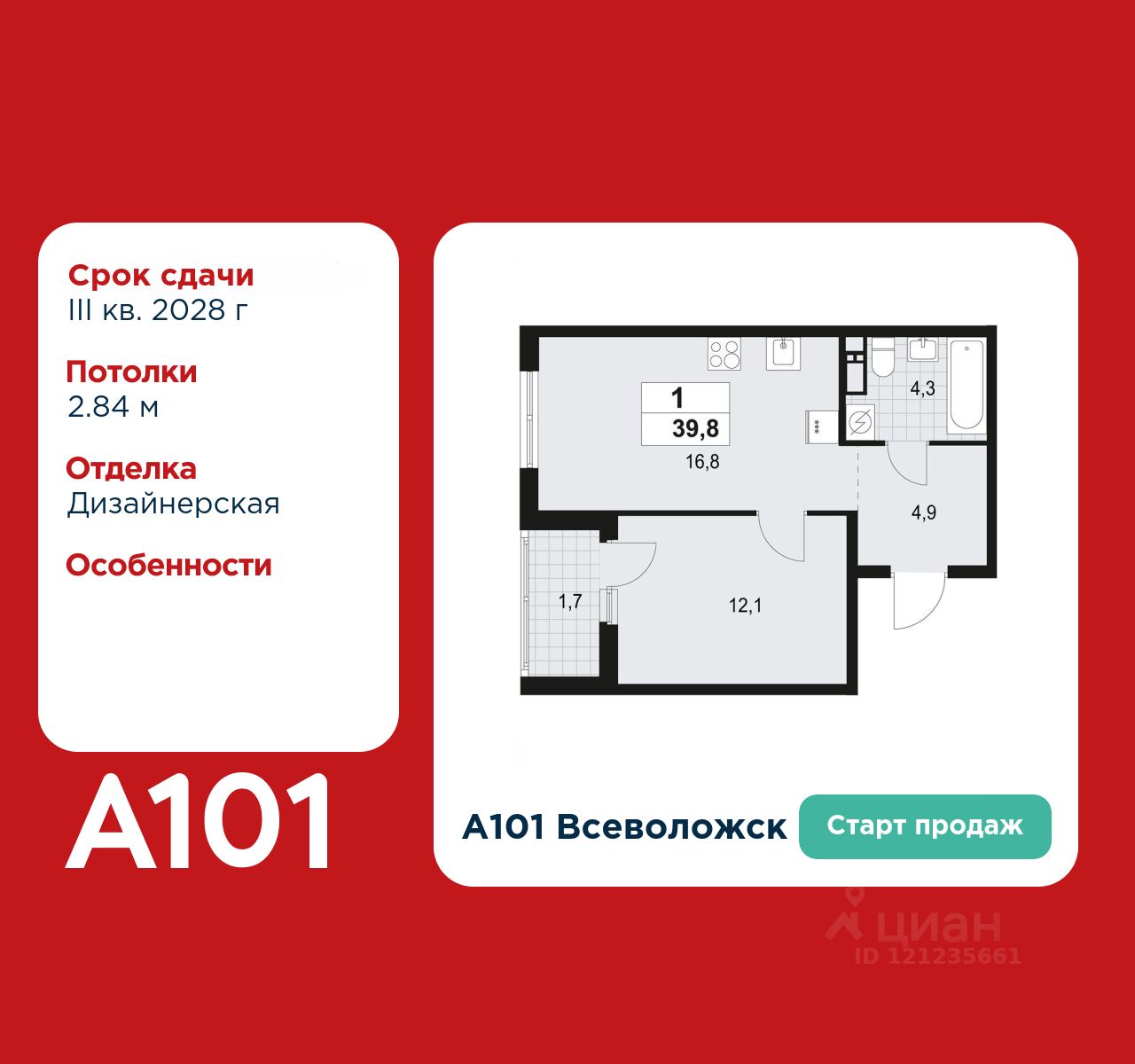 1-комнатная квартира площадью 39.80 в ЖК "А101 Всеволожск" c лоджией на 12 этаже. Квартира с отделкой. Вид из окна на улицу. В квартире 1 санузел. Высота потолков 2.84 м.
