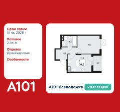 1-комнатная квартира площадью 34.80 в ЖК "А101 Всеволожск" c лоджией на 12 этаже. Квартира с отделкой. Вид из окна на улицу. В квартире 1 санузел. Высота потолков 2.84 м.