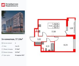Удобная, классическая, функциональная европланировка, большая кухня-гостиная 17.06 м², просторная прихожая 5.25 м². Общая площадь квартиры - 37.18 м², жилая 10.74 м², высота потолка 2.77 м.