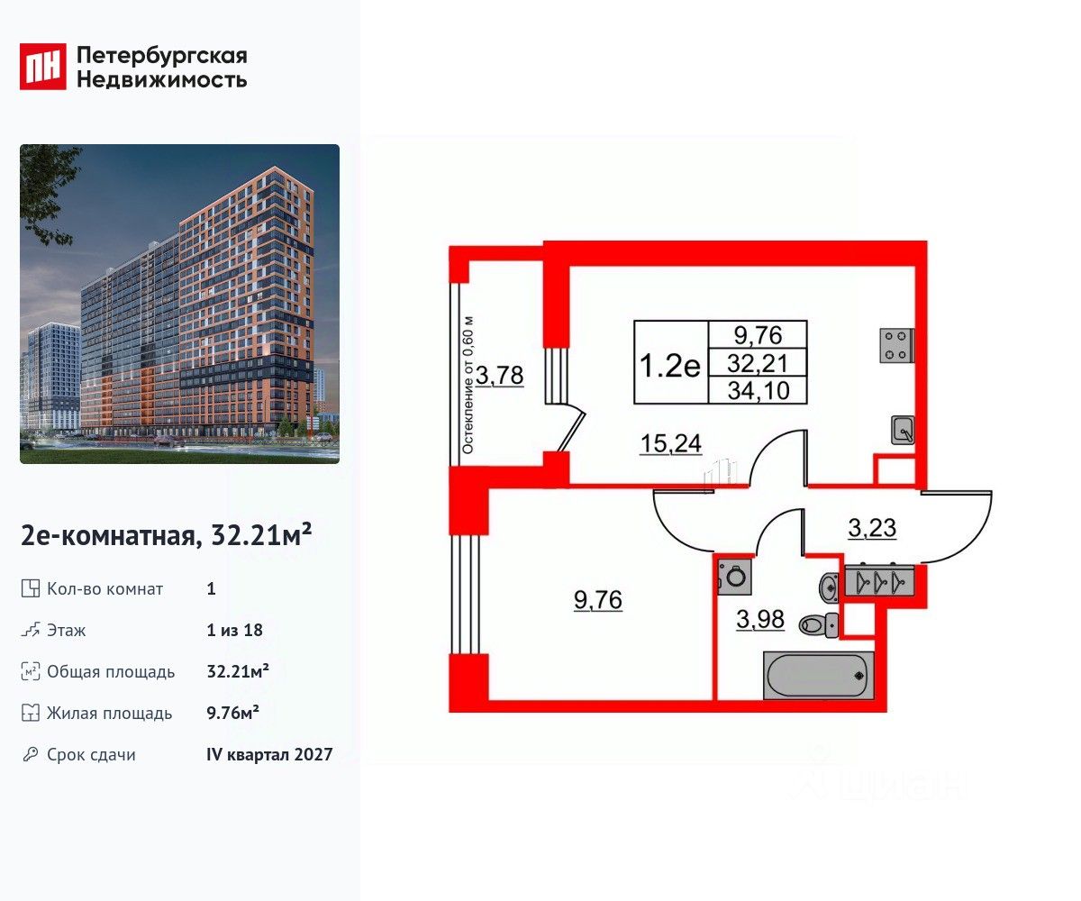 Удобная, классическая, функциональная европланировка, большая кухня-гостиная 15.24 м², вместительная прихожая 3.23 м². Общая площадь квартиры - 32.21 м², жилая 9.76 м², высота потолка 2.77 м.