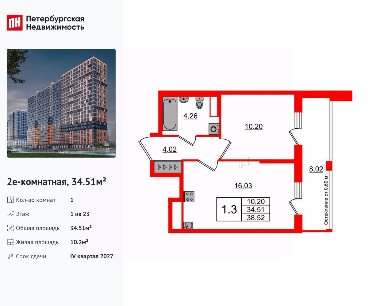 Удобная, классическая, функциональная европланировка, большая кухня-гостиная 16.03 м², вместительная прихожая 4.02 м². Общая площадь квартиры - 34.51 м², жилая 10.2 м², высота потолка 2.77 м.