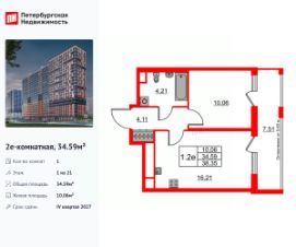 Удобная, классическая, функциональная европланировка, большая кухня-гостиная 16.21 м², вместительная прихожая 4.11 м². Общая площадь квартиры - 34.59 м², жилая 10.06 м², высота потолка 2.77 м.