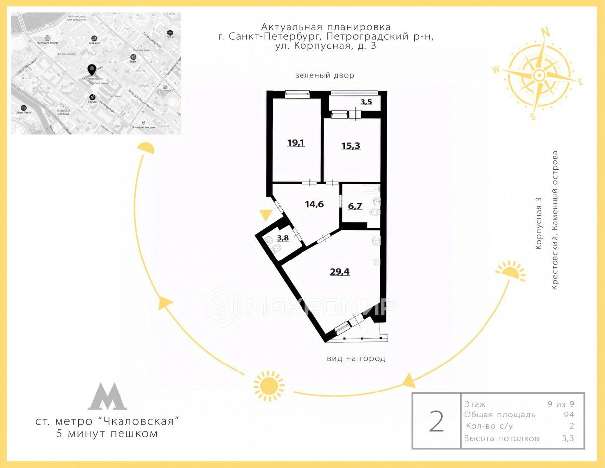 Арт. 127834451 Предлагается уникальная квартира в ЖК "Мендельсон" в престижном Петроградском районе на ул. Корпусная, д. 3. Квартира европланировки с 2-мя спальнями и просторной кухней-гостиной с панорамным видом на достопримечательности Санкт-Петербурга. Квартира расположена на верхнем 9-м эт. с высокими потолками 3,3 м, с индивидуальной вентиляционной шахтой. Кухня-гостиная имеет выход на террасу с открывающимися видами на Ленинградскую Телебашню, шпиль и купол Петропавловского собора, зелень Каменного и Крестовского островов, вид из спален в благоустроенный двор, одна спальня имеет лоджию со стеклопакетами LUMON.