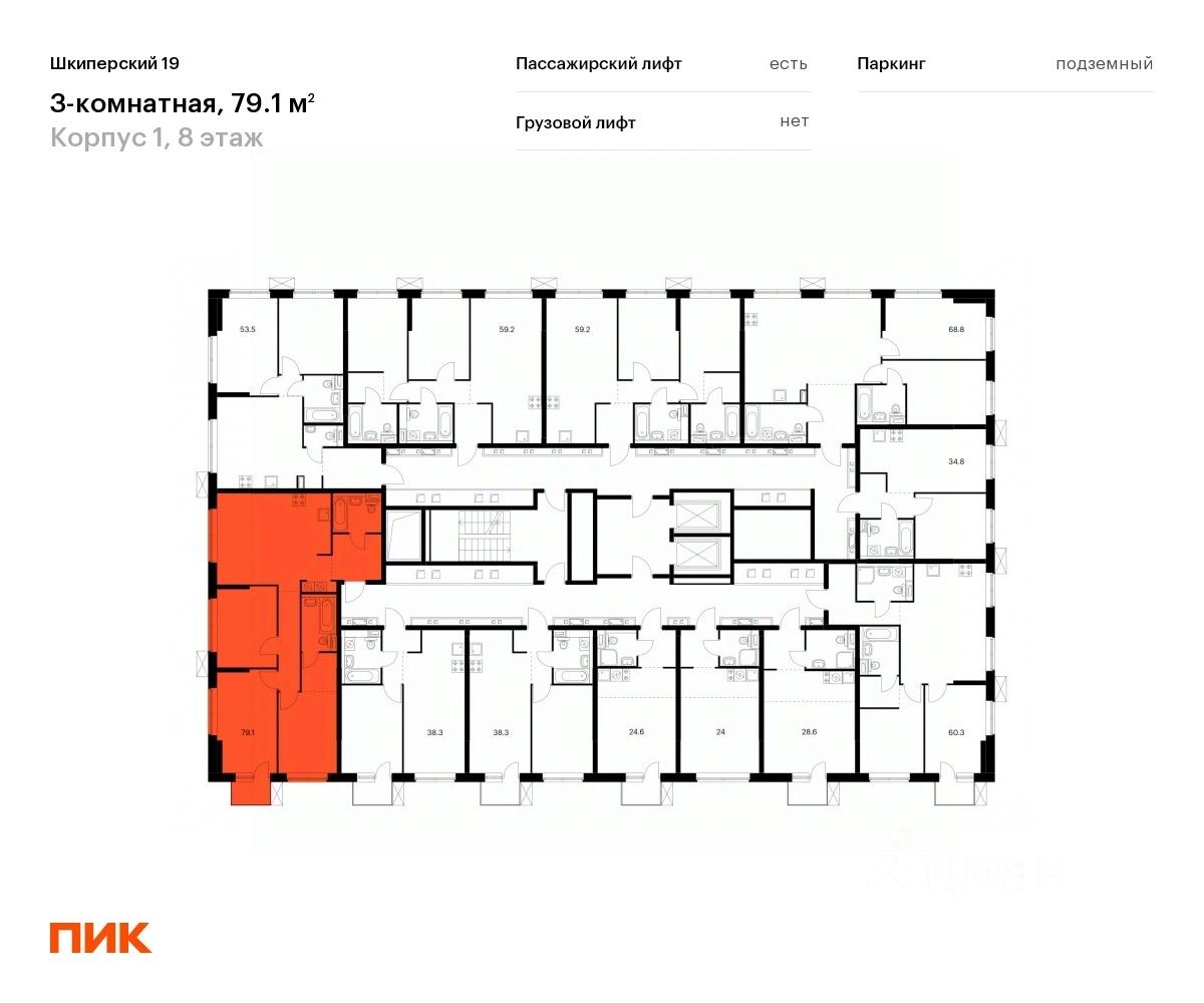 Продаётся 3-комн. квартира площадью 78,8 кв.м на 8 этаже 12 этажного дома (Корпус 1, Секция 4) проекта ПИК Шкиперский 19. Светлый просторный подъезд на уровне земли, функциональная планировка, большие окна, предчистовая отделка.