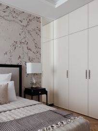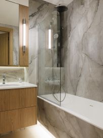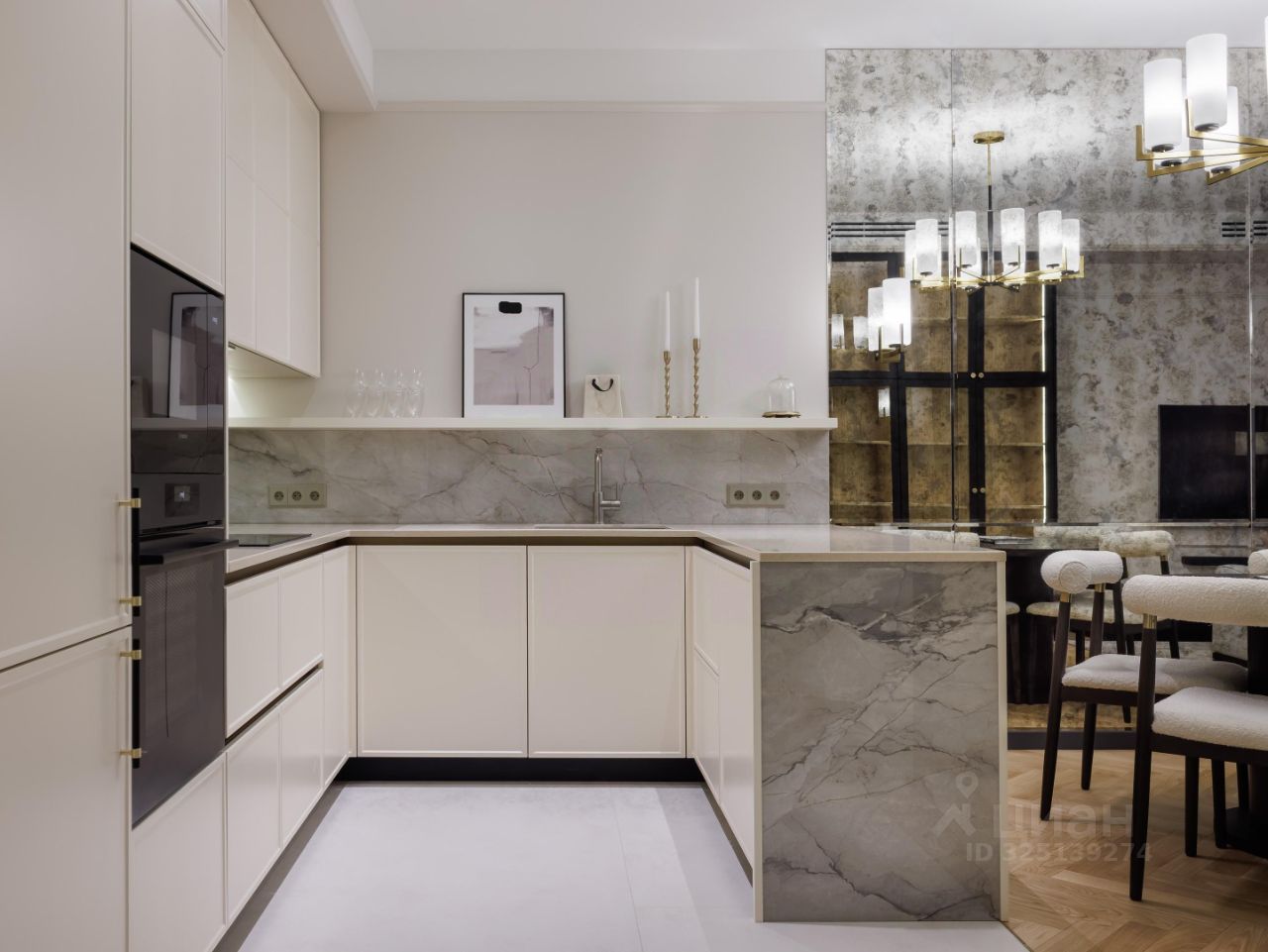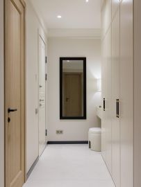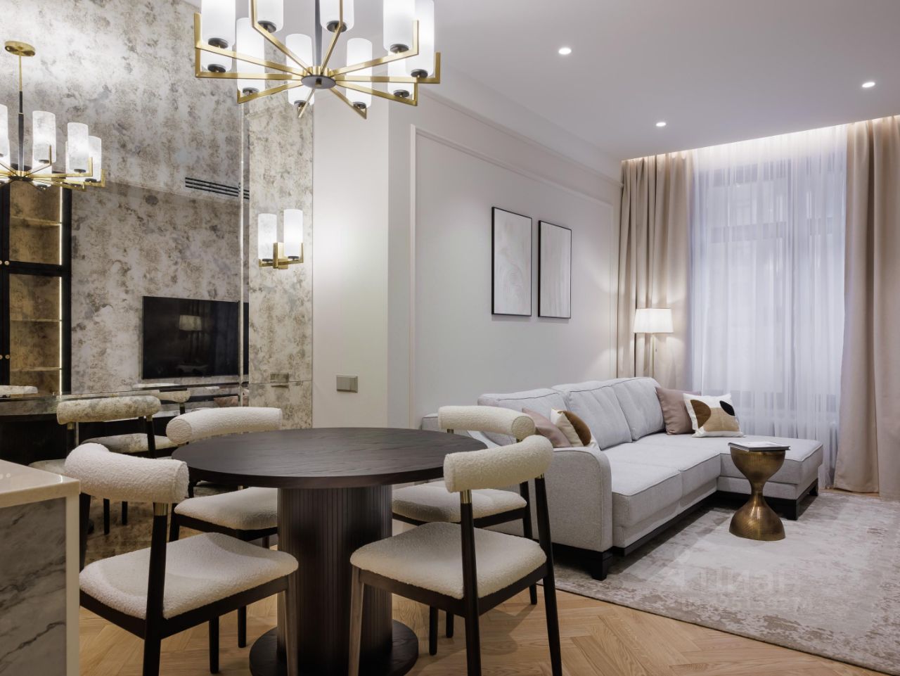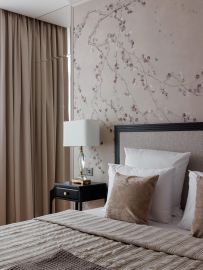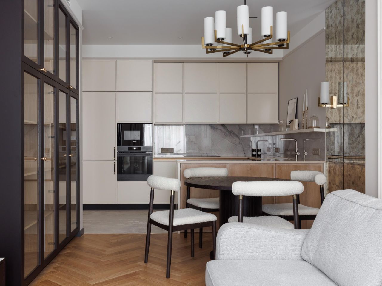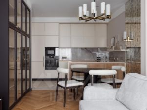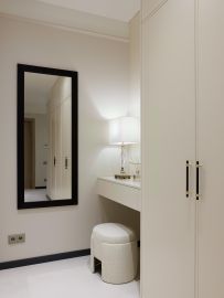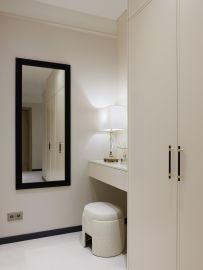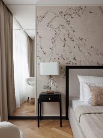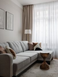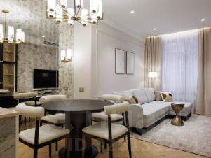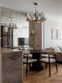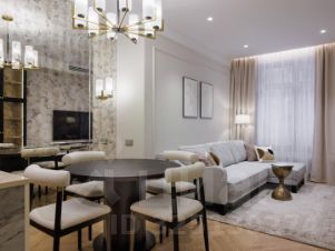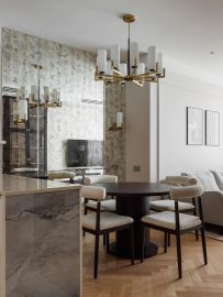 Разумный метраж этой квартиры с одной спальней и дневной зоной делает премиум класс доступным. Тихие тёплые цвета поддерживают равновесие и спокойствие. Высокие двери со шпоном из натурального дуба и строгая лепнина на стенах указывают на высокий класс интерьера, наряду с выверенным балансом объемов всех зон.