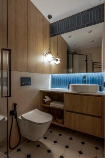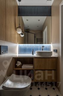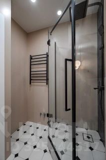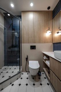 В санузле установлена душевая кабина с системой тропического душа, также предусмотрен шкаф для хранения моющих средств. Санузел оснащен теплым полом.