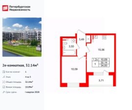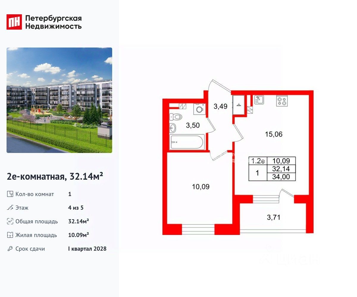 Удобная, классическая, функциональная европланировка, большая кухня-гостиная 15.06 м², вместительная прихожая 3.49 м². Общая площадь квартиры - 32.14 м², жилая 10.09 м², высота потолка 2.77 м.