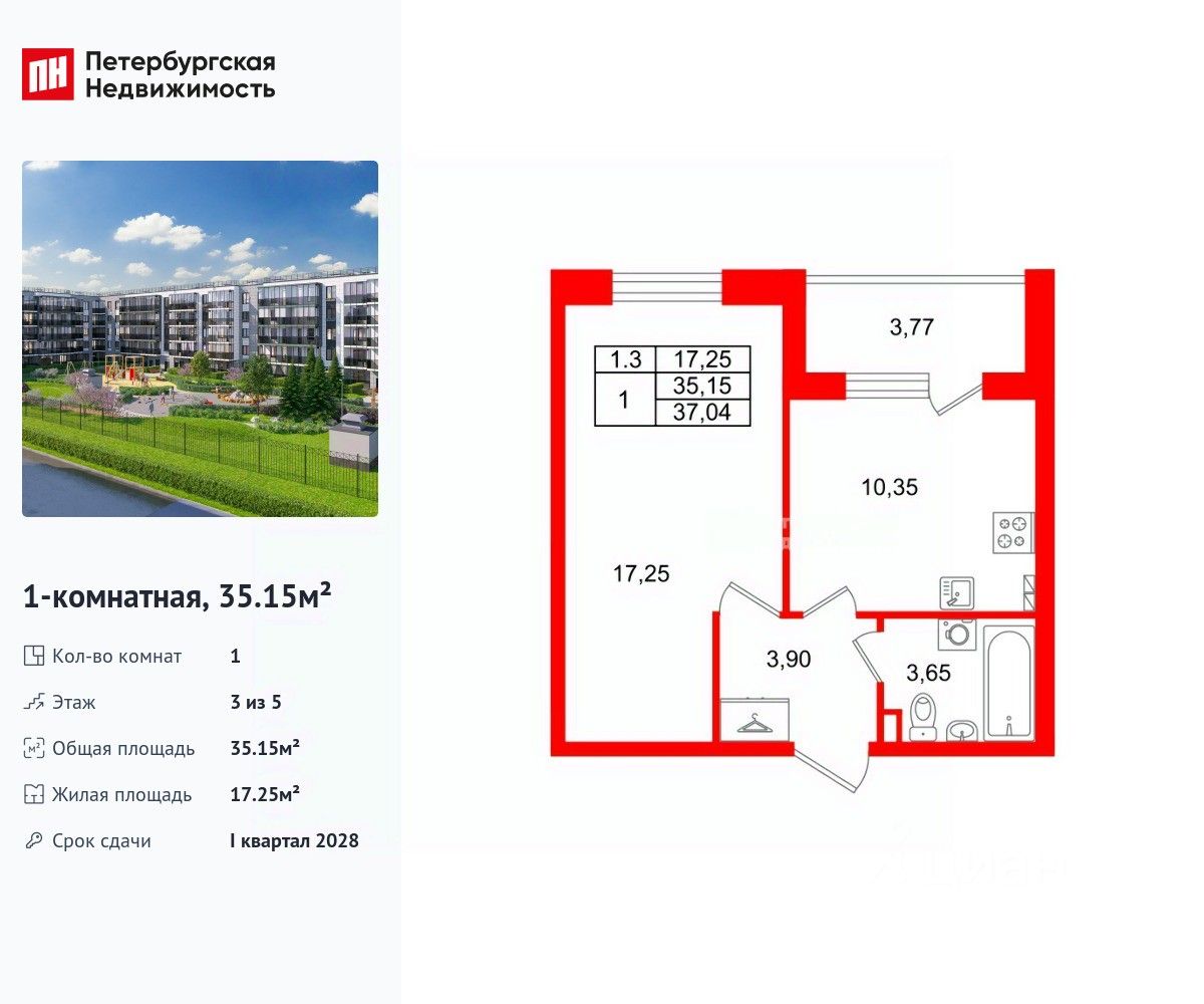 Удобная, классическая планировка, кухня 10.35 м², вместительная прихожая 3.9 м². Общая площадь квартиры - 35.15 м², жилая 17.25 м², высота потолка 2.77 м.