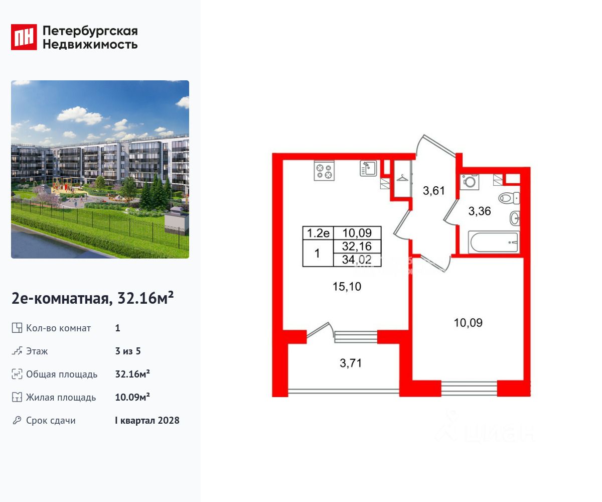 Удобная, классическая, функциональная европланировка, большая кухня-гостиная 15.1 м², вместительная прихожая 3.61 м². Общая площадь квартиры - 32.16 м², жилая 10.09 м², высота потолка 2.77 м.