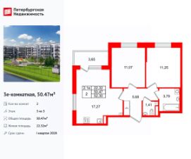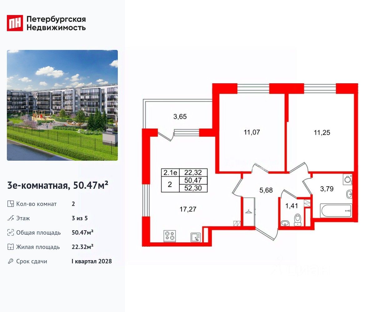 Удобная, классическая, функциональная европланировка, большая кухня-гостиная 17.27 м², вместительная прихожая 5.68 м². Общая площадь квартиры - 50.47 м², жилая 22.32 м², высота потолка 2.77 м.