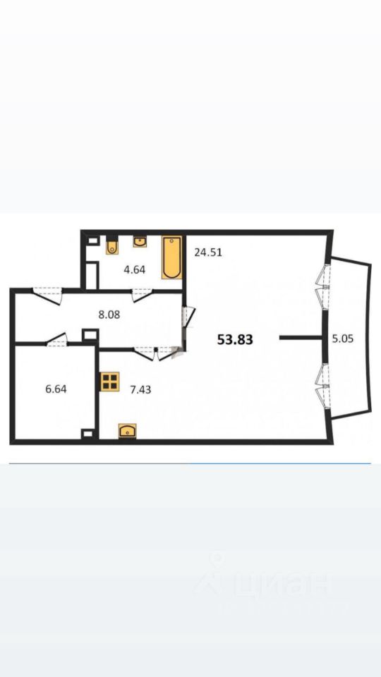 Общая приведенная площадь квартиры 53.83 м². Квартира 51.4 м² + лоджия 5 м².